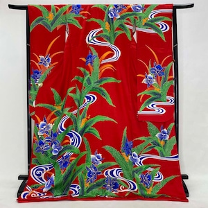 本振袖 引き振袖 正絹 赤色 花柄 古典 刺繍 結婚式 比翼仕立て 裄65.7cm 身丈180cm Bランク 花嫁衣装 Mサイズ 3683